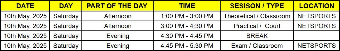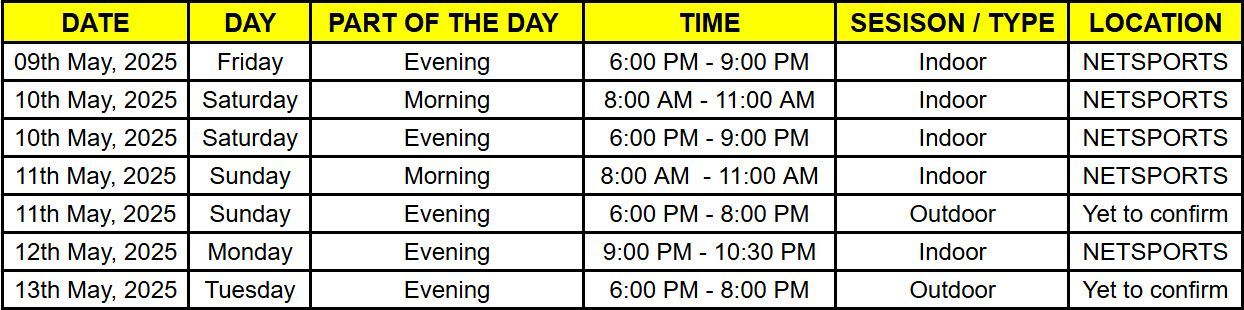 The Coaching Camp will be planned only for the dates and timings mentioned below, Final schedule will be planned based on the number of registrations for each level. Please keep yourself available for all these dates.