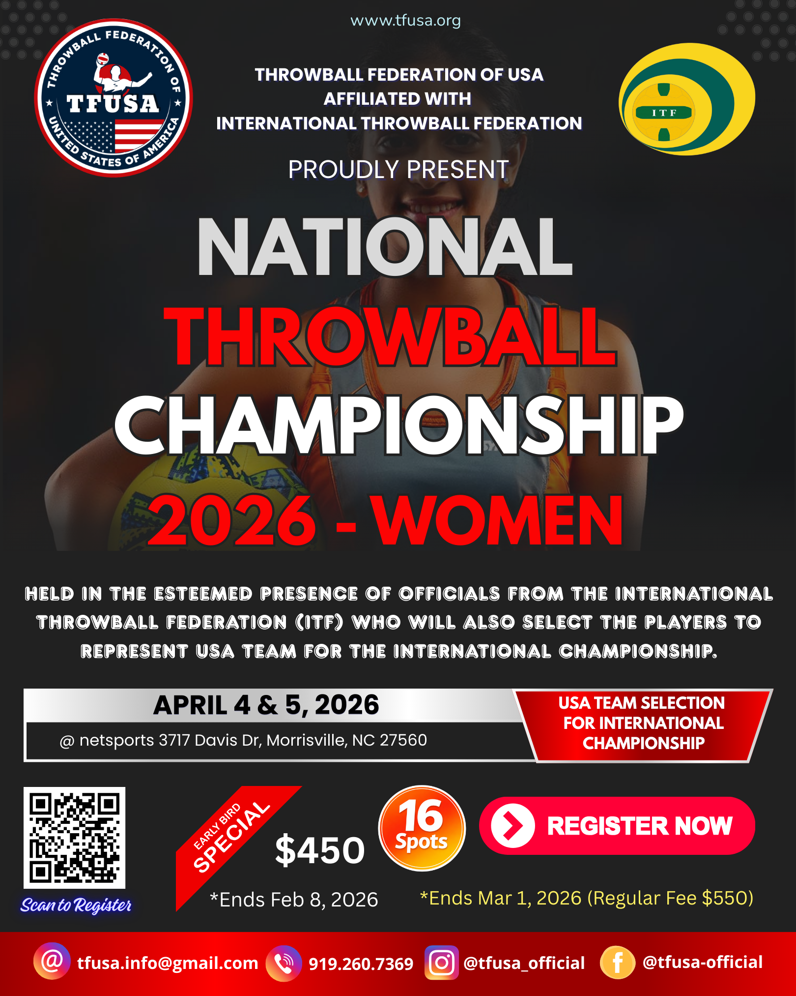 Register your team for the upcoming national championship event on April 4 & 5, 2026. Held in the esteemed presence of officials from the International Throwball Federation (ITF) who will also select the players to represent USA team for the international championship.
